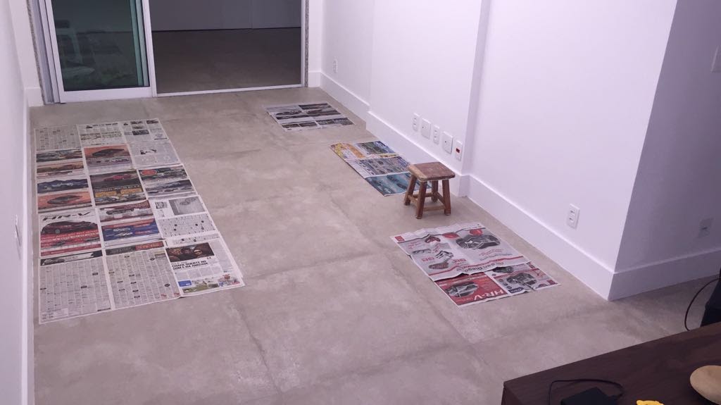 Na dúvida, faça como na foto: marque a posição dos móveis na casa nova com jornal ou fita. Isso ajuda bastante na hora de definir o melhor tamanho dos móveis e avaliar a área de circulação.