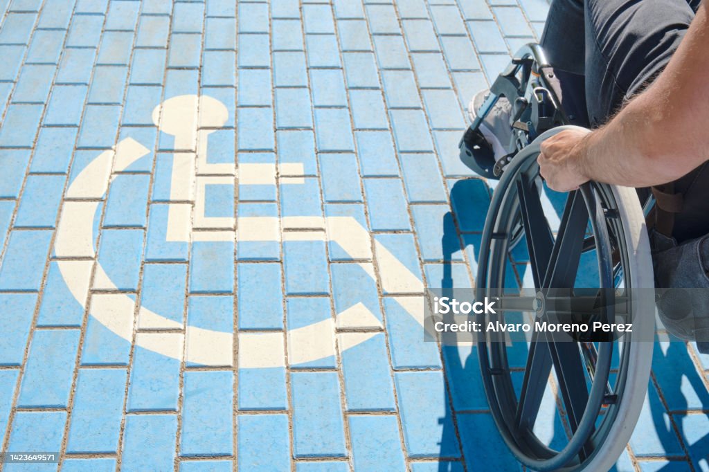 unrecognizable handicapped man in a wheelchair passing over blue and white handicapped sign painted on the floor
