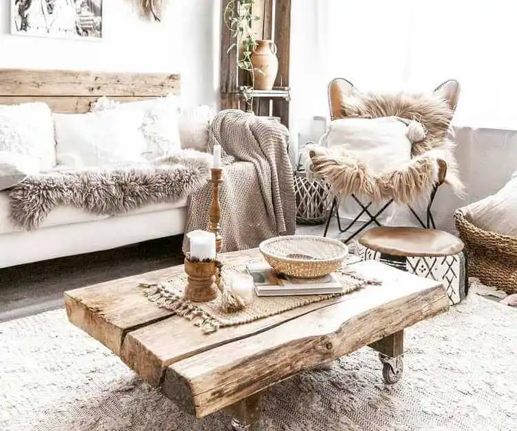 O mobiliário Boho tem como principal matéria prima a madeira e pode estar por toda a casa ou em todo ambiente. Sofás amplos, móveis confortáveis com design arredondado e forros coloridos arrasam nessa decoração. Um toque especial pode ser dado por um móvel antigo garimpado em uma loja de relíquias em sua cidade.