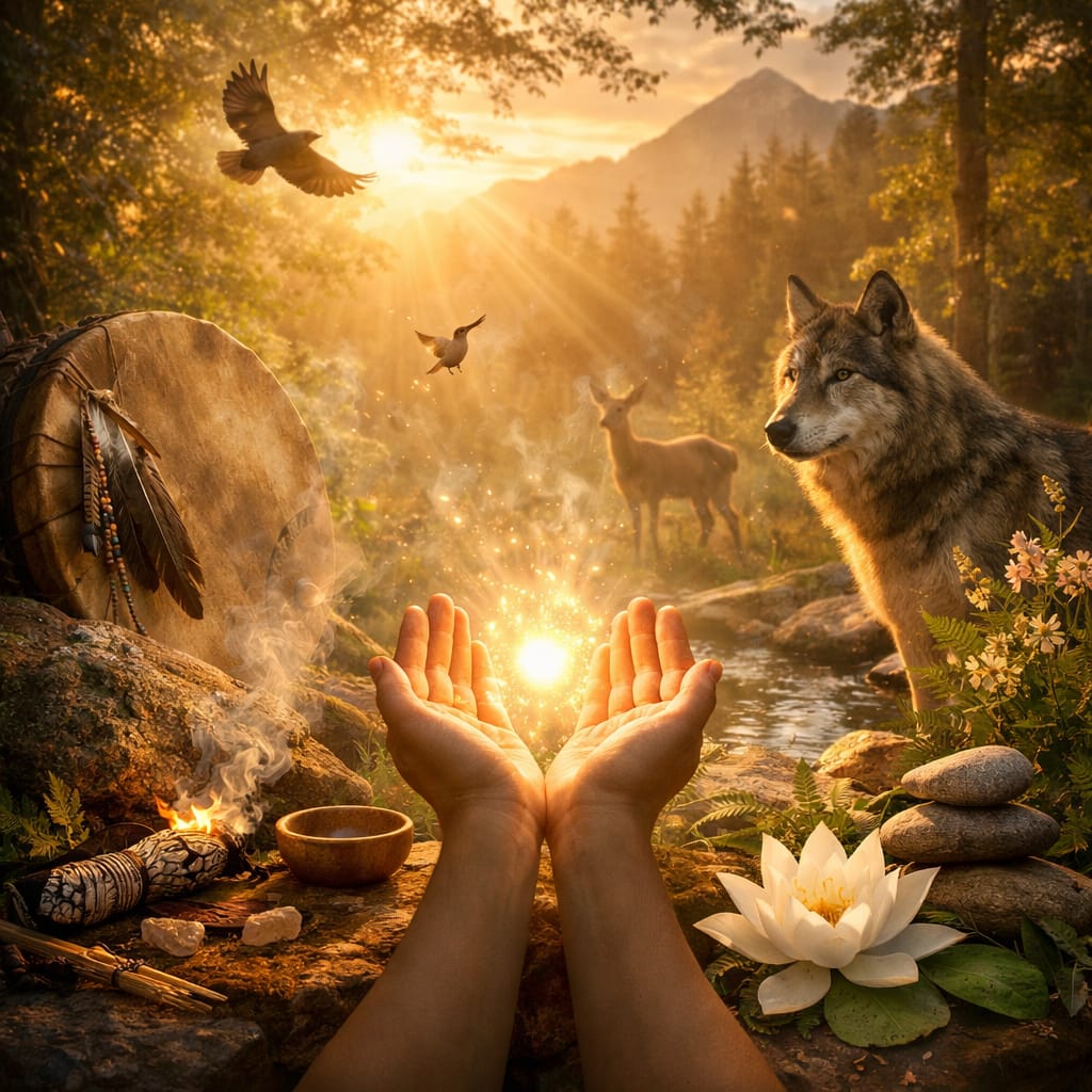 Quando o Reiki dialoga com a visão xamânica, o olhar se amplia. O cuidado deixa de ser apenas individual e passa a considerar o impacto das emoções, do ambiente e das relações na saúde. Esse encontro resgata algo fundamental: *a consciência de pertencimento.*