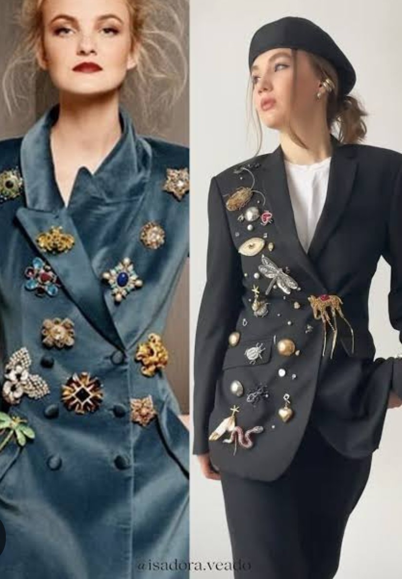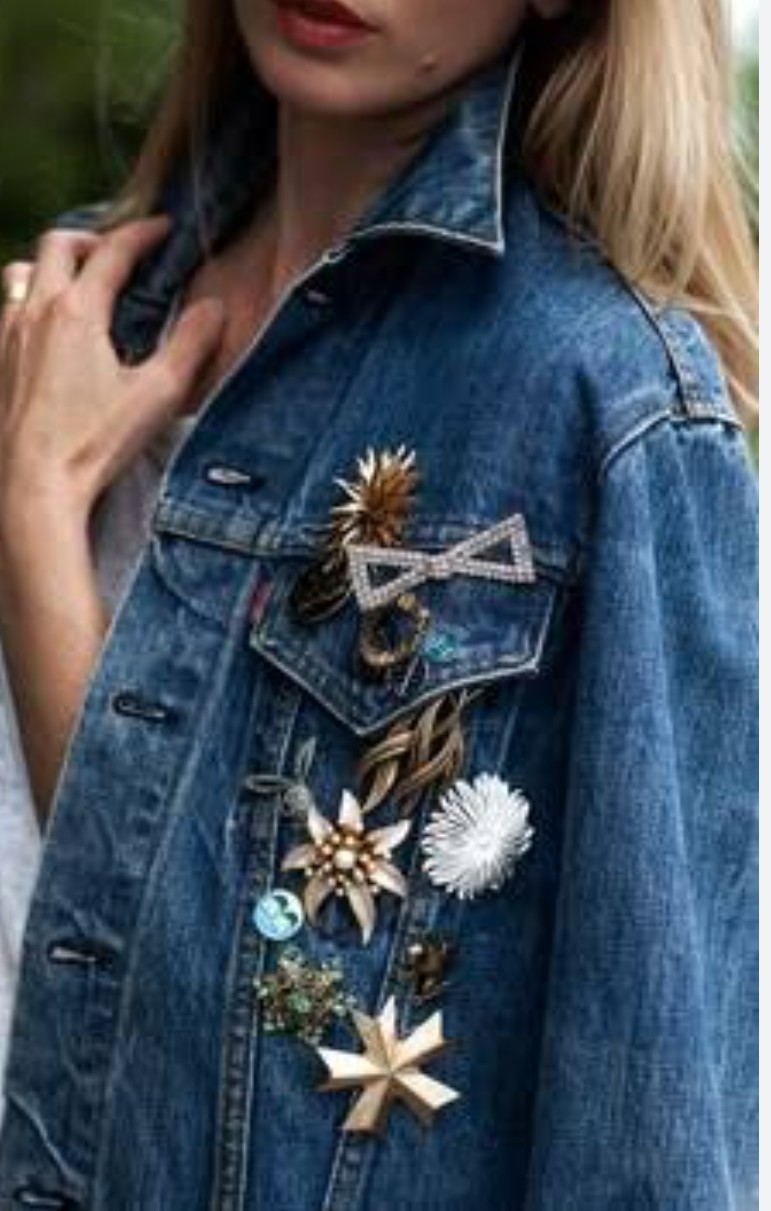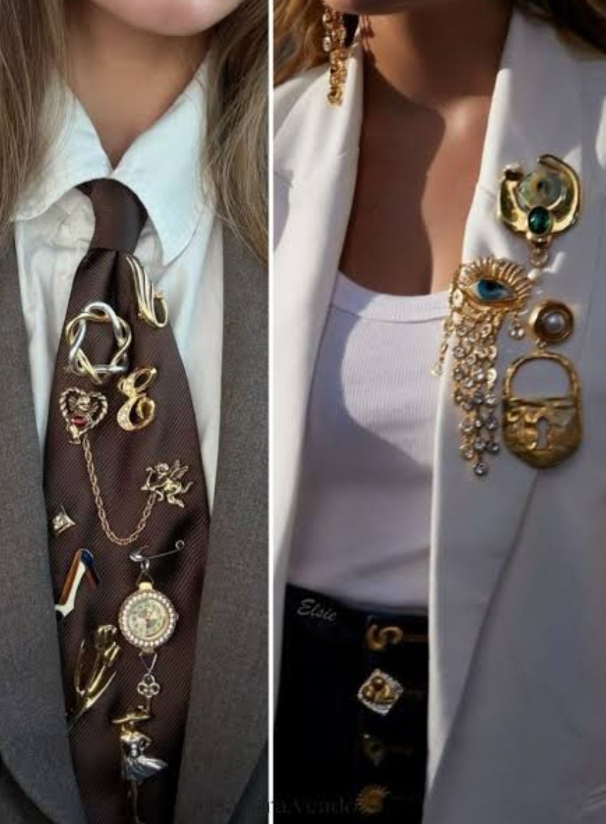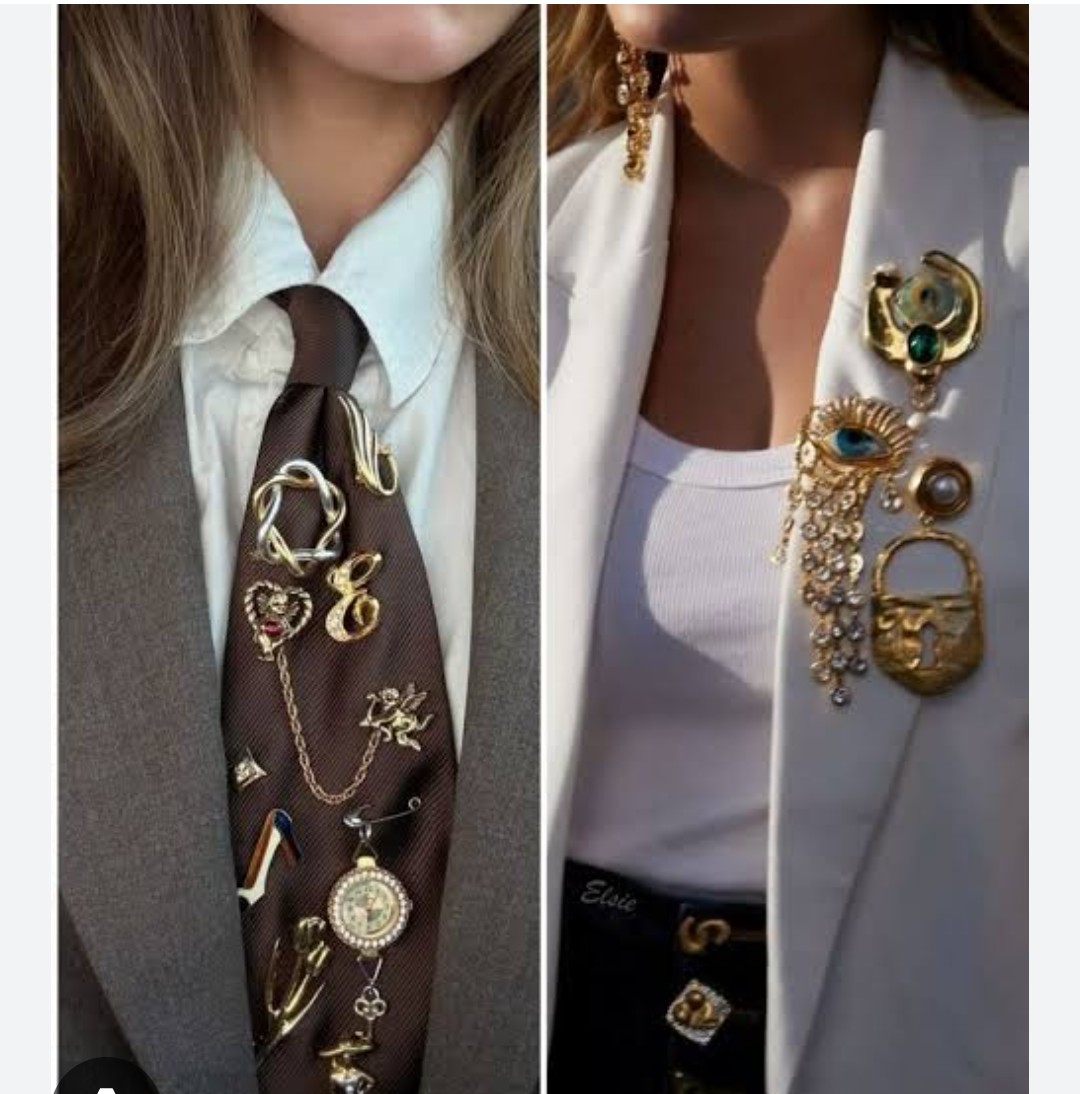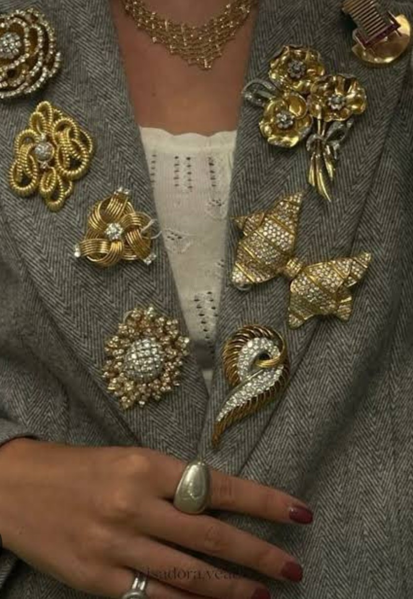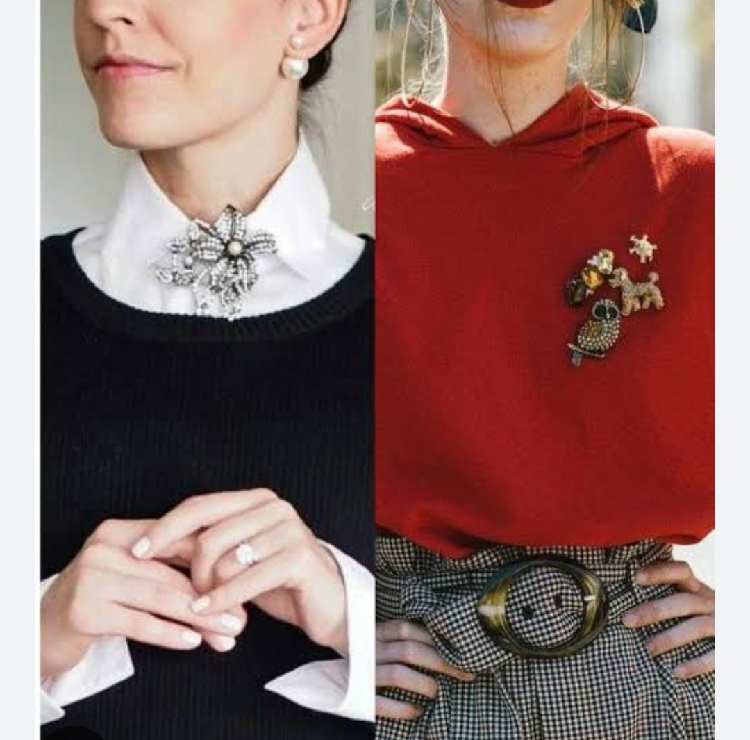 Broches , sim , broches desde do tempo de 40 até o tempo atual . Momento Esse de Vocês irem no Guarda-roupa da Avó, Tia , Bisa , Mãe e fazer um apanhado e usar de várias formas como trouxe nas Fotos.